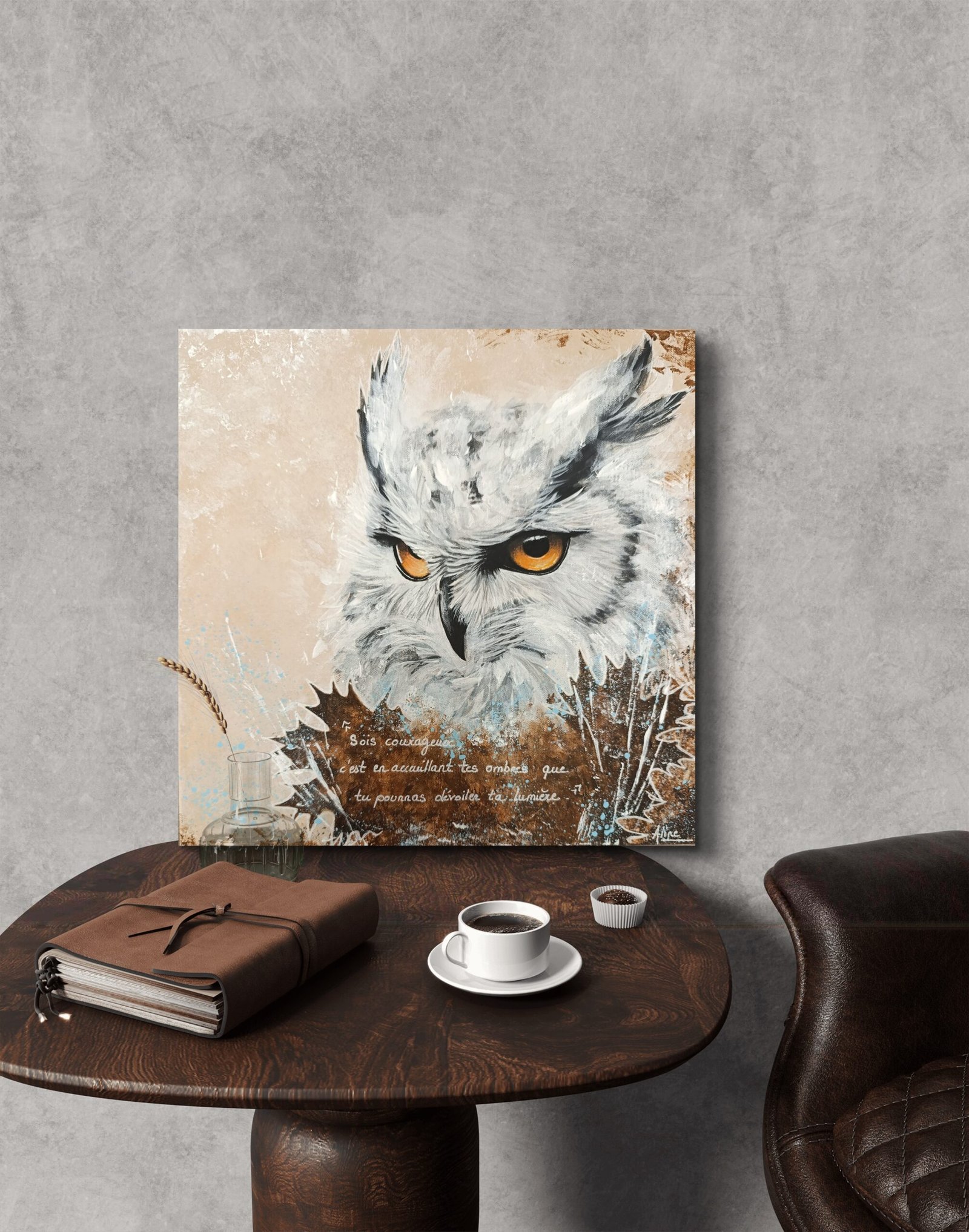 Cette peinture représente un hibou dans un face-à-face direct, symbole de lucidité et de regard intérieur.