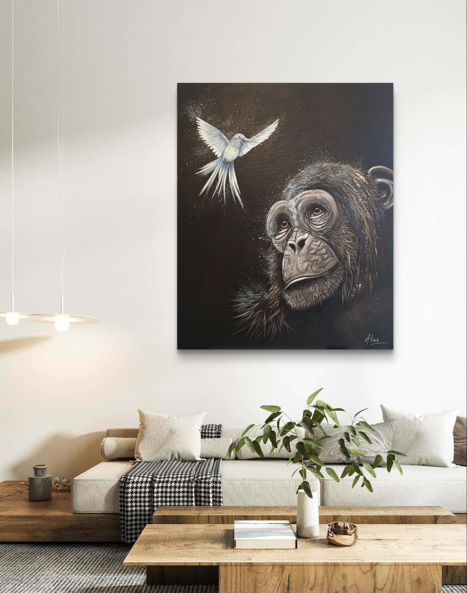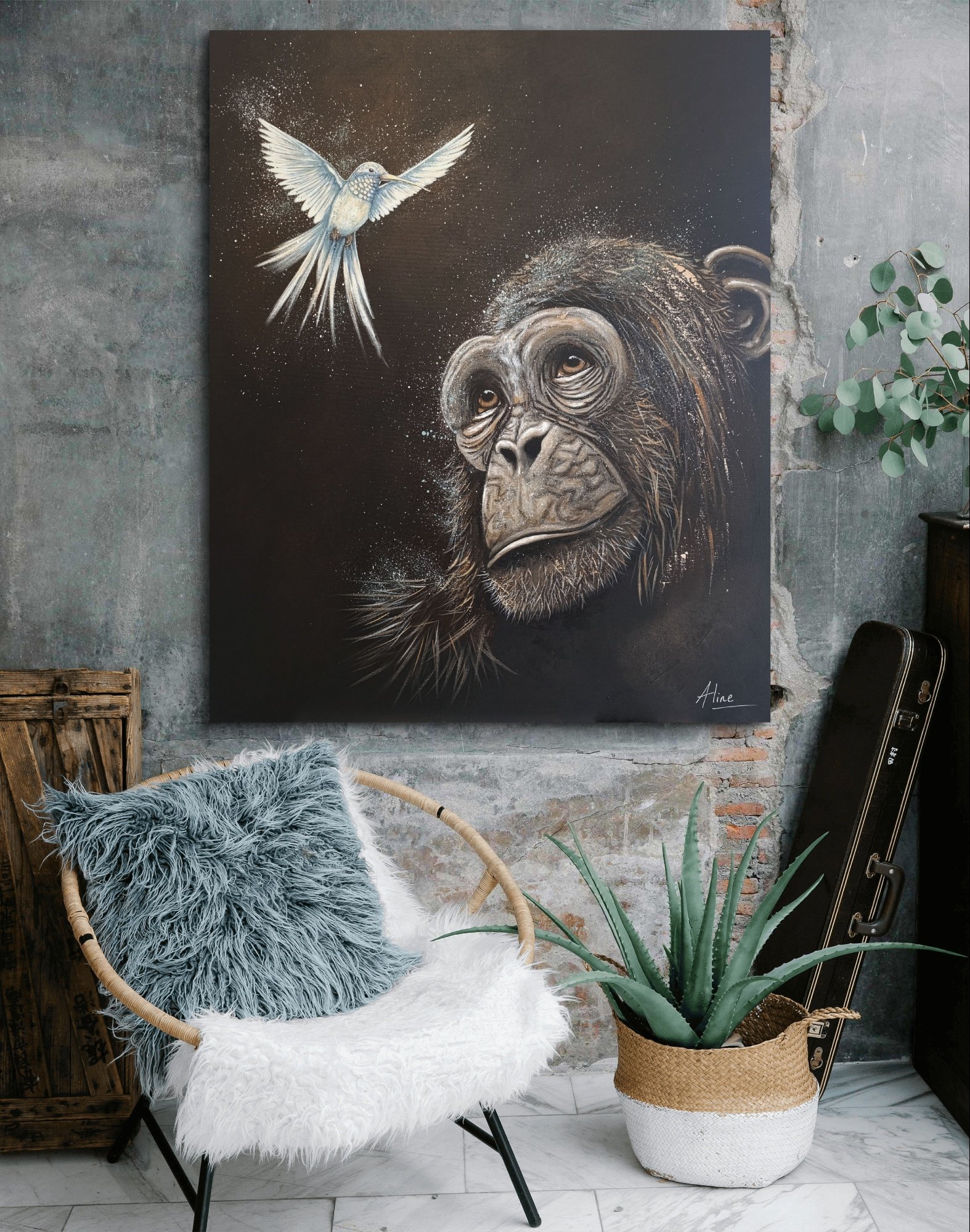 Peinture réalisée en hommage à Jane Goodall, femme de cœur qui a consacré sa vie à relier l’humain, l’animal et la Terre.