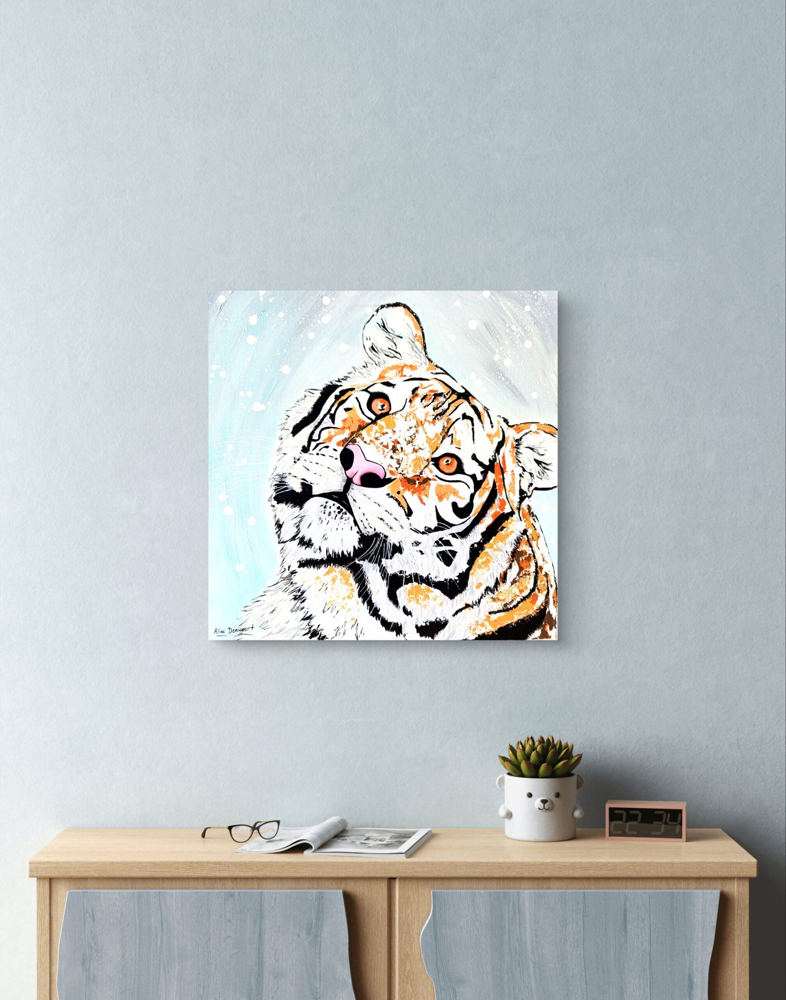 Le tigre, habituellement symbole de puissance et de fougue, se laisse ici surprendre par la danse silencieuse des flocons.