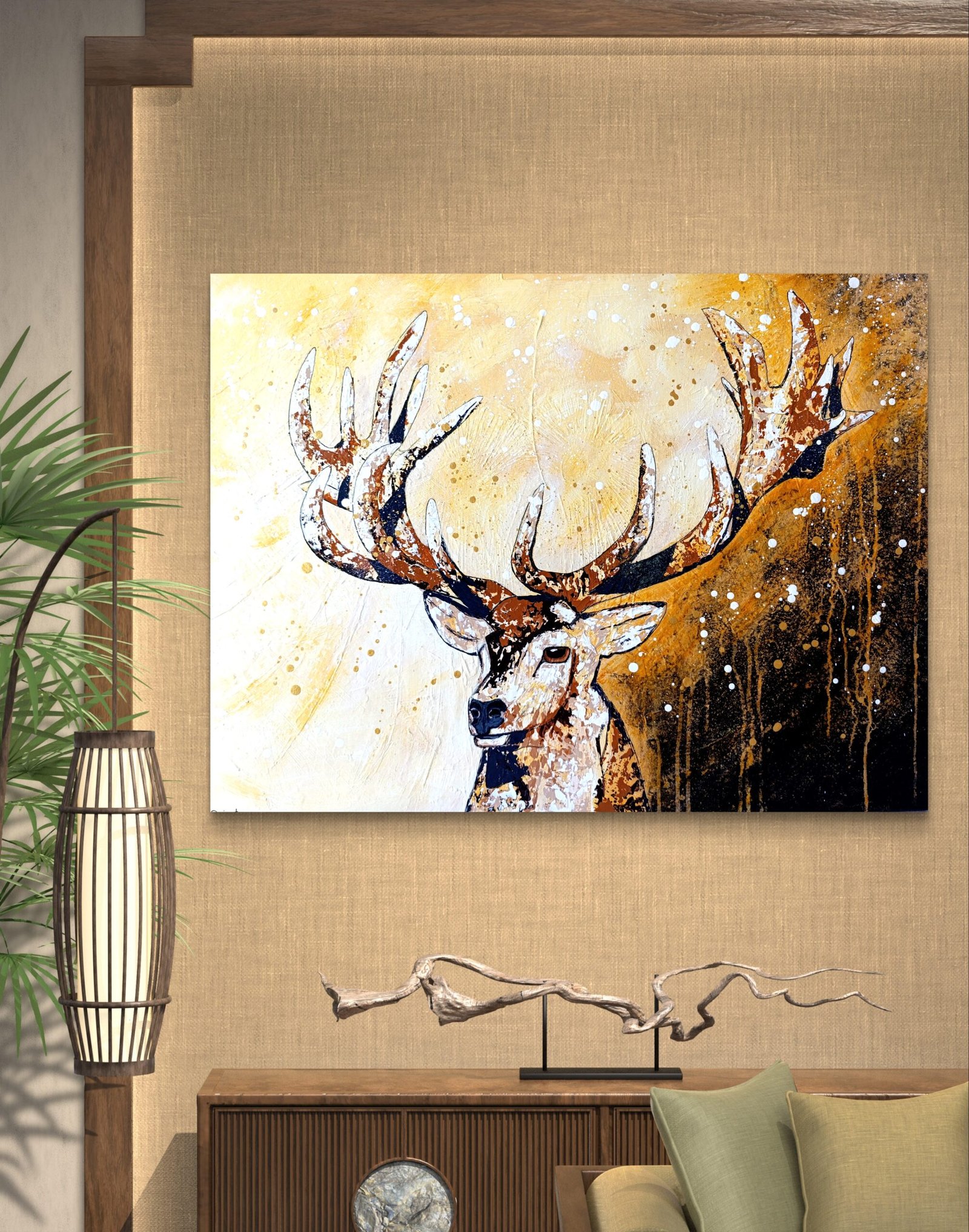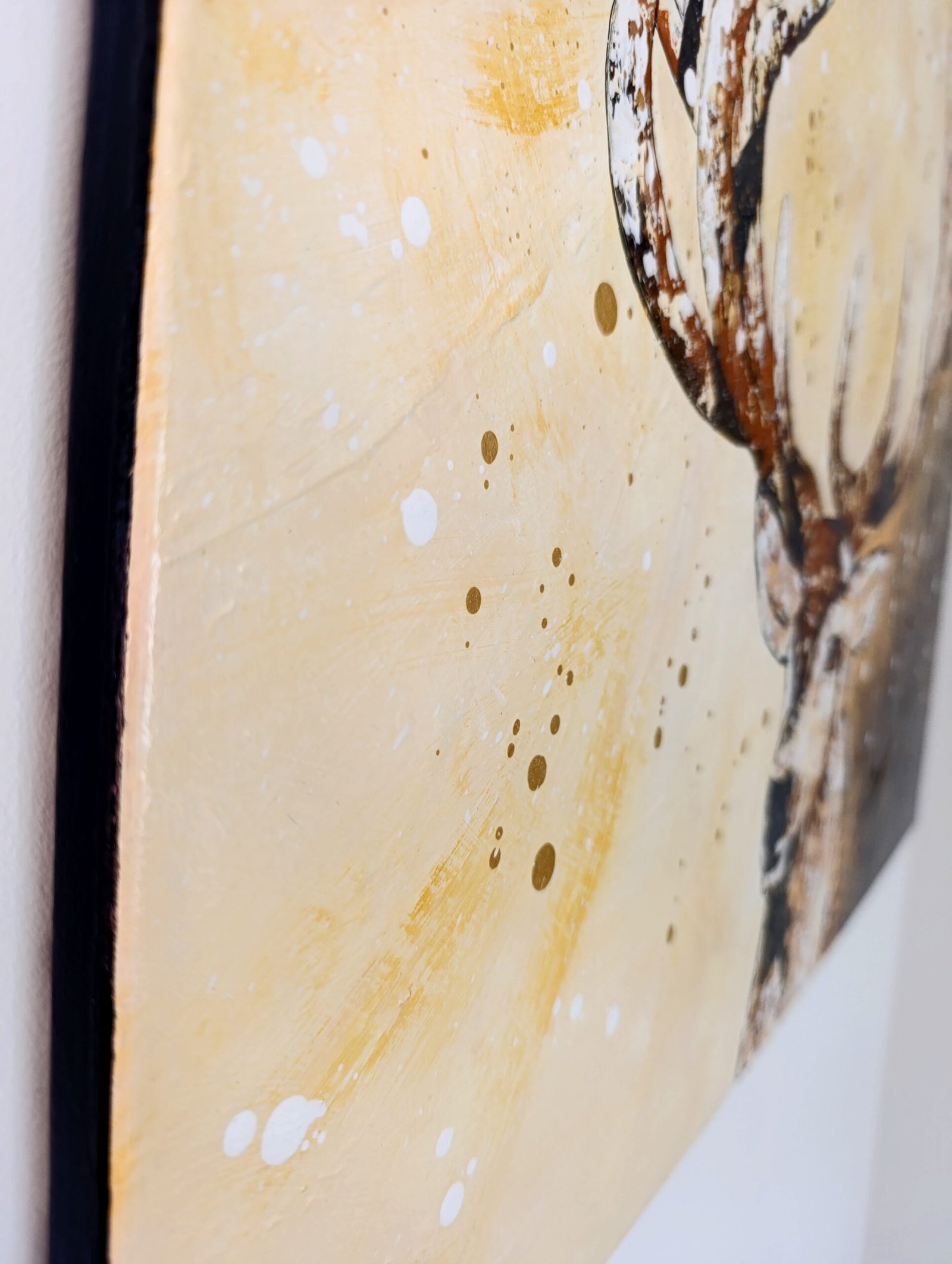 À travers ce tableau, Le Grand Prince de la Forêt nous rappelle l’importance de la connexion au vivant, la beauté du renouveau et la force tranquille de ceux qui avancent avec dignité.
