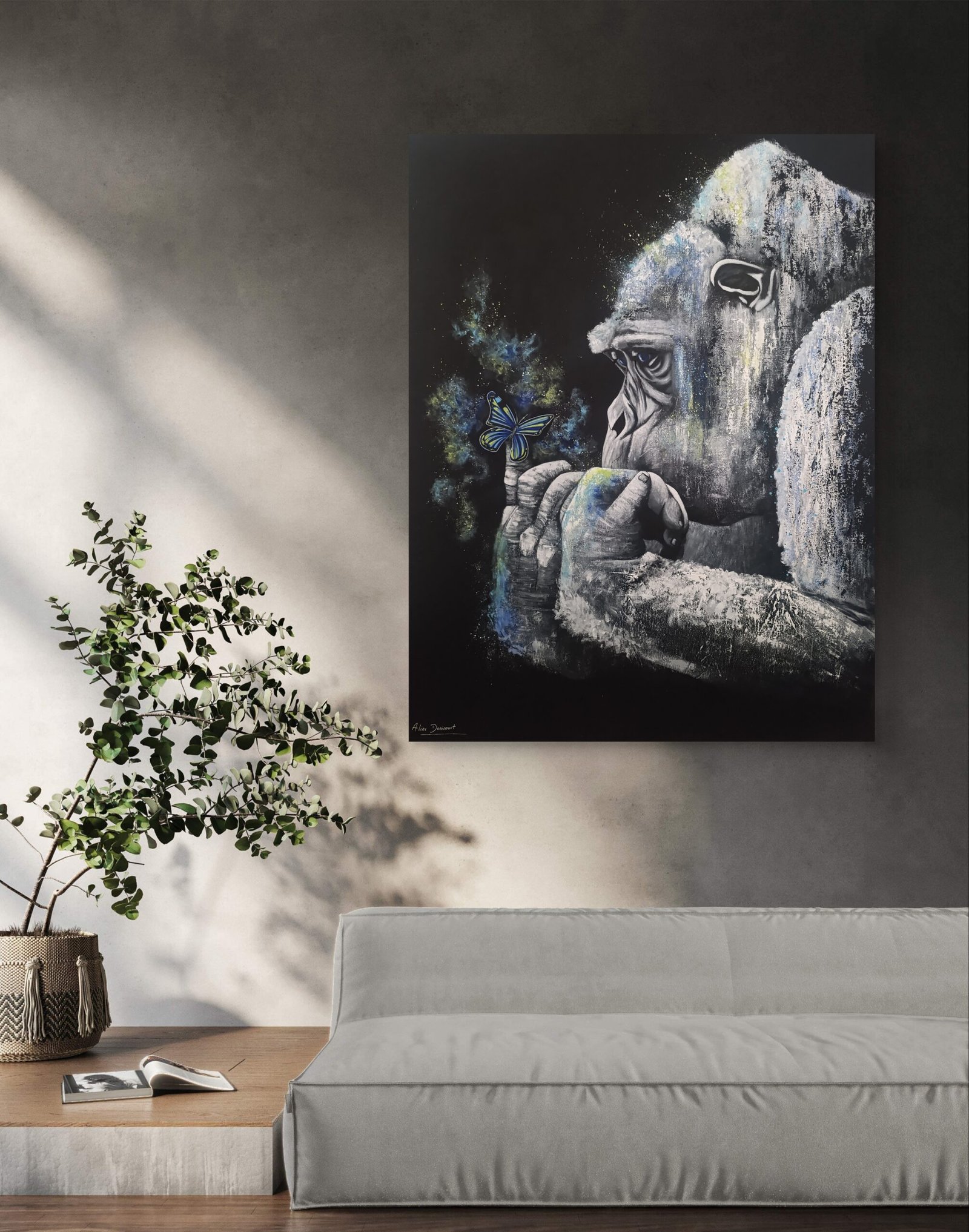 Le papillon, symbole de métamorphose, devient ici messager d’espérance et de renouveau. Face à lui, le regard du gorille incarne la patience, la profondeur et la conscience du vivant.